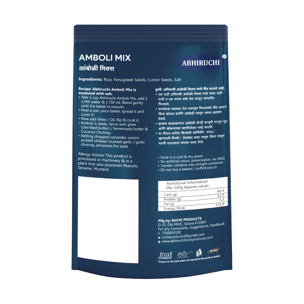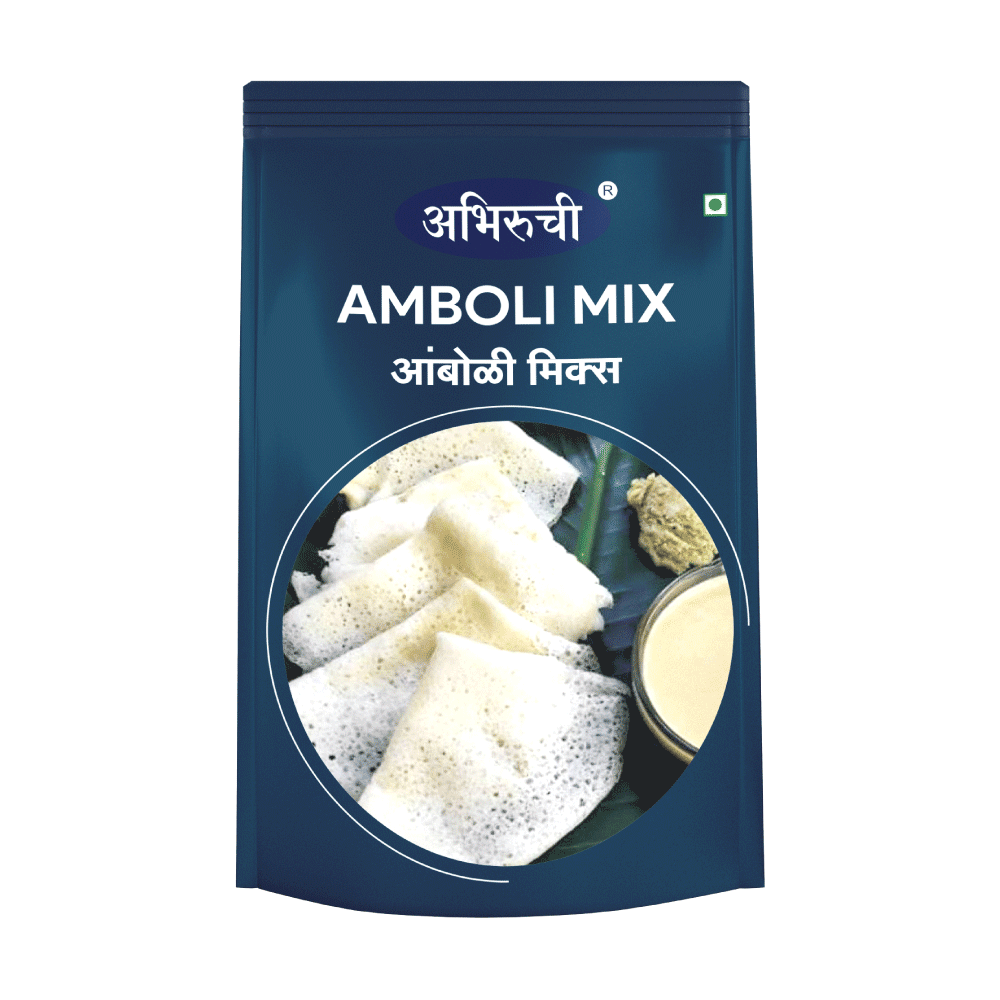 Abhiruchi Amboli Mix is made of rice, Fenugreek seeds, cumin seeds and is seasoned with salt. A fresh batter can be created by adding water and oil to this mix.The batter when cooked with ghee, prepares the most delicious Amboli, best enjoyed with coconut chutney.