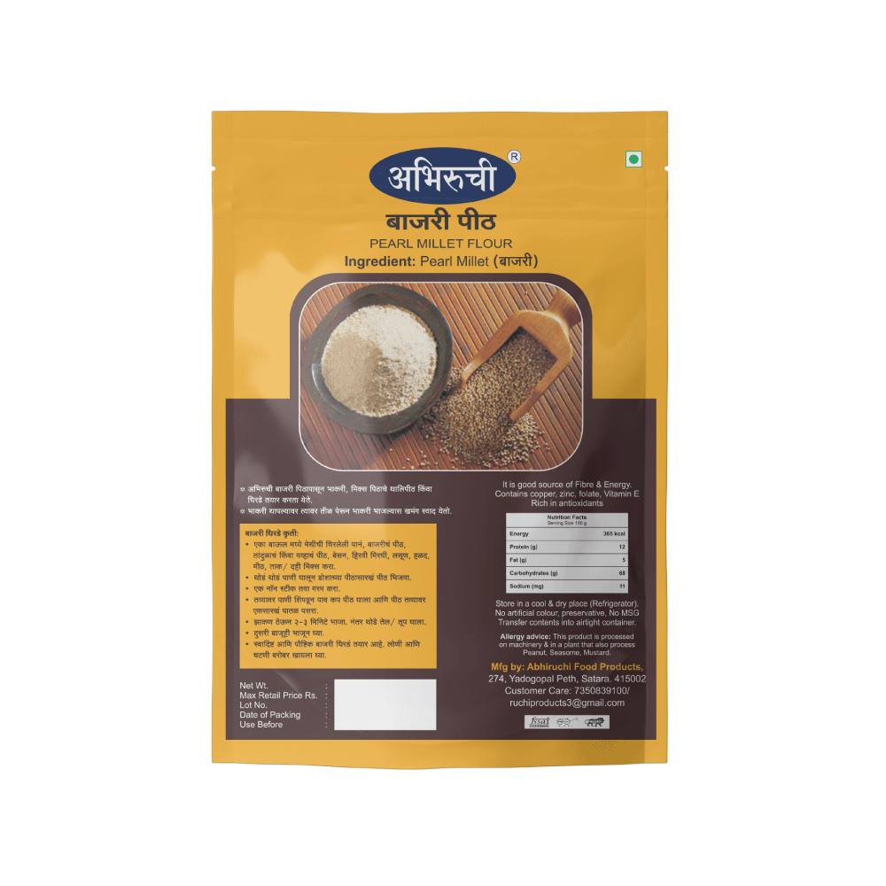 Abhiruchi Bajri Pith (pearl millet flour) is made from well-sourced bajri and makes for soft bhakris as well as dhirda and thalipeeth of mixed pulses.