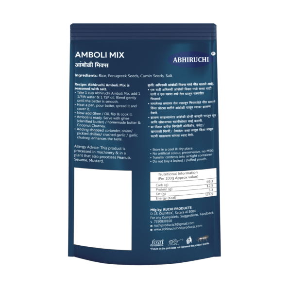 Abhiruchi Amboli Mix is made of rice, Fenugreek seeds, cumin seeds and is seasoned with salt. A fresh batter can be created by adding water and oil to this mix.The batter when cooked with ghee, prepares the most delicious Amboli, best enjoyed with coconut chutney.