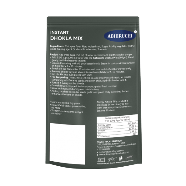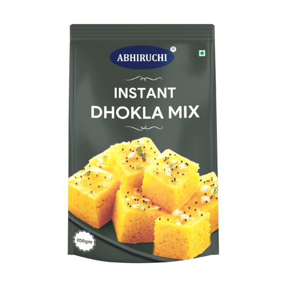 Add 3 cups of water (750ml) in the cooker and put cooker on the gas. Add 1 ½ cups of water to the Abhiruchi Dhokla Mix (200gm). Blend gently until the batter is smooth. Grease dhokla tray with oil, pour batter into it. Steam in cooker without whistle on high flame for 20 minutes. Switch off the flame after 20 minutes and remove the lid of cooker immediately. Remove dhokla tray and allow it to cool completely for 5-10 minutes. Cut dhokla into even pieces with knife.